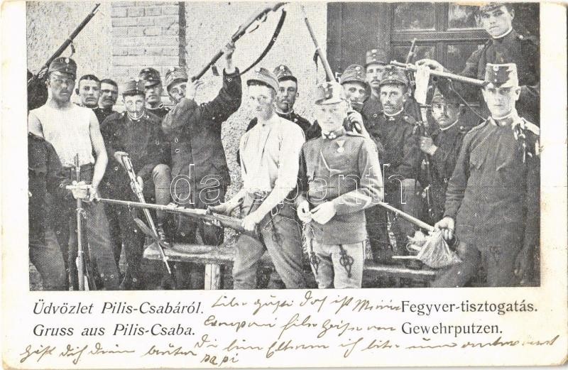 1903 Piliscsaba, katonák fegyver-tisztogatás közben / Gewehrputzen https://www.darabanth.com/de/32-Gross-Auktion/32.1/Ansichtskarten/Ungarn~13725/1903-Piliscsaba-katonak-fegyver-tisztogatas-kozben-Gewehrputzen~II2038270