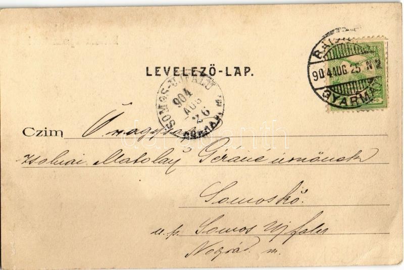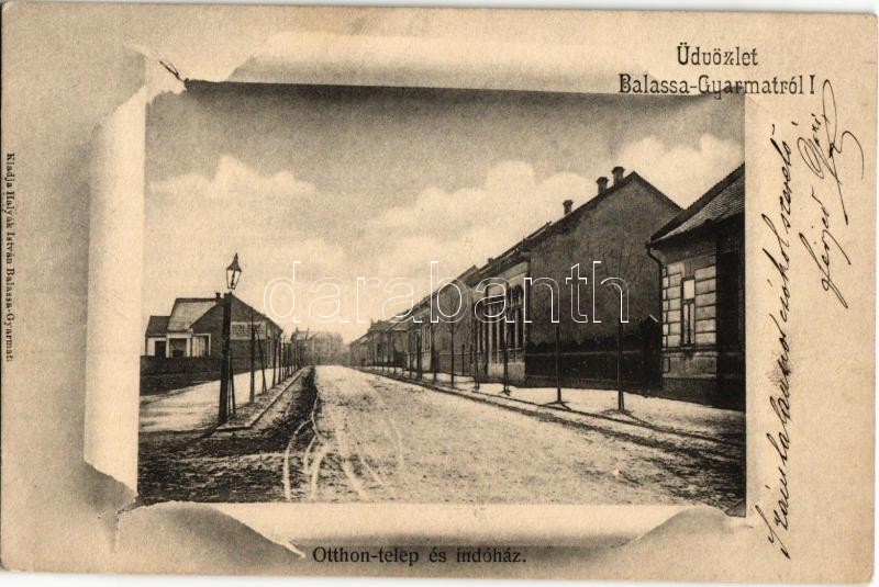 Beschreibung: 1904 Balassagyarmat, Otthon-telep és indóház, vasútállomás télen. Halyák István kiadása, Art Nouveau
