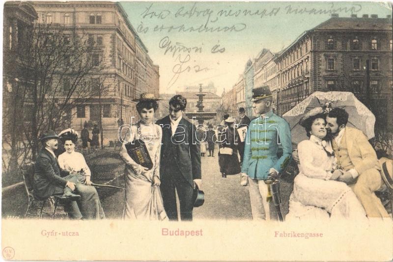 1904 Budapest VI. Gyár utca (mai Liszt Ferenc tér), montázs urakkal és... https://www.darabanth.com/de/32-Gross-Auktion/32.1/Ansichtskarten/Ungarn~13725/1904-Budapest-VI-Gyar-utca-mai-Liszt-Ferenc-ter-montazs-urakkal-es-holgyekkel-Fabrikengas~II2043514