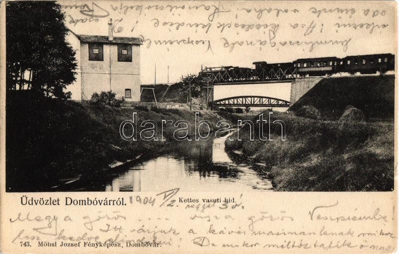 1904 Dombóvár, Kettes vasúti híd vonattal. Möhsl József fényképész https://www.darabanth.com/de/32-Gross-Auktion/32.1/Ansichtskarten/Ungarn~13725/1904-Dombovar-Kettes-vasuti-hid-vonattal-Mohsl-Jozsef-fenykepesz~II1943268