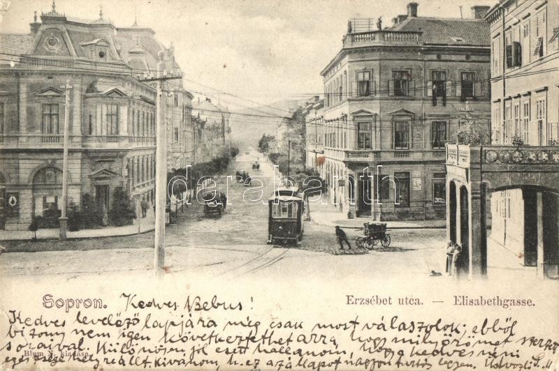 1904 Sopron, Erzsébet utca, villamos, Újhelyi ház. Kiadja Blum N. (EB) https://www.darabanth.com/de/32-Gross-Auktion/32.1/Ansichtskarten/Ungarn~13725/1904-Sopron-Erzsebet-utca-villamos-Ujhelyi-haz-Kiadja-Blum-N-EB~II1840738