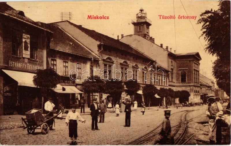 1906 Miskolc, Széchenyi utca, Tűzoltó őrtorony, villamossínek, Istvánf... https://www.darabanth.com/de/32-Gross-Auktion/32.1/Ansichtskarten/Ungarn~13725/1906-Miskolc-Szechenyi-utca-Tuzolto-ortorony-villamossinek-Istvanffy-testverek-uzlete-t~II1941689