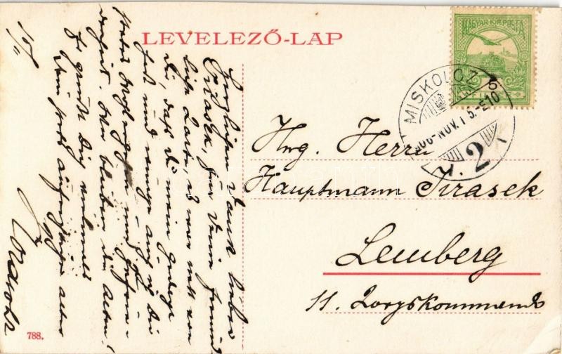 Beschreibung: 1906 Miskolc, Széchenyi utca, Tűzoltó őrtorony, villamossínek, Istvánffy testvérek üzlete, talicskás férfi. W.L. (?) 788. (vágott / cut)