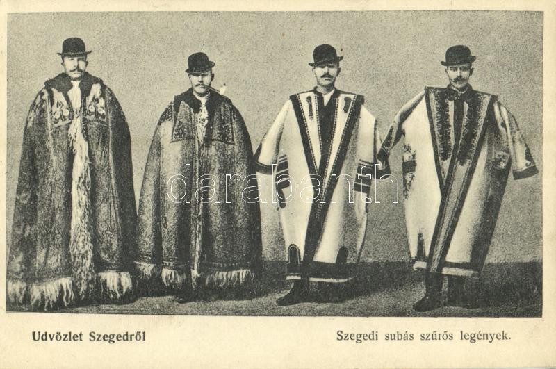 1910 Szeged, szegedi subás szűrös legények, folklór https://www.darabanth.com/de/32-Gross-Auktion/32.1/Ansichtskarten/Ungarn~13725/1910-Szeged-szegedi-subas-szuros-legenyek-folklor~II2035719