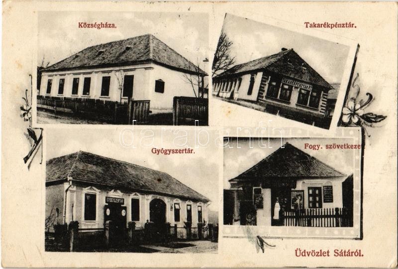 Beschreibung: 1912 Sáta (Ózd), Községháza, takarékpénztár, Gyógyszertár, Fogyasztási szövetkezet üzlete. floral