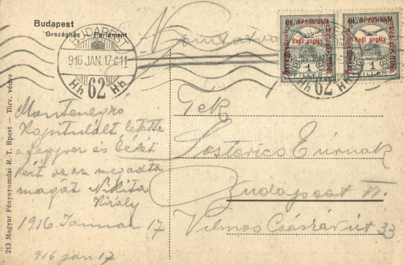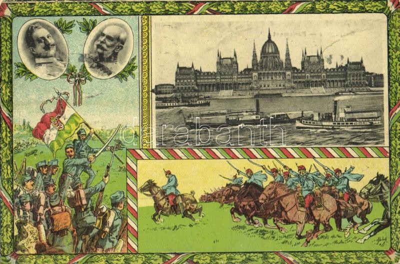 1916 Budapest V. Országház, gőzhajók. Ferenc József, Vilmos császár. Hazafias litho keret K.u.K. katonákkal és magyar zászlóval / Franz Joseph and Wilhelm II, Viribus Unitis (EK)