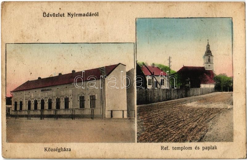 1916 Nyírmada, Községháza, Református templom és paplak (fl) https://www.darabanth.com/de/32-Gross-Auktion/32.1/Ansichtskarten/Ungarn~13725/1916-Nyirmada-Kozseghaza-Reformatus-templom-es-paplak-fl~II2027347