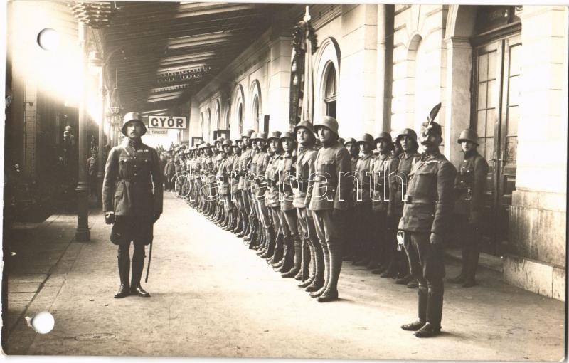 1921 Győr, IV. Károly magyar király és Zita királyné második visszatérési kísérlete, díszszázad katonái a vasútállomáson a királyi vonat mellett, távirda és távbeszélő hivatal. Schäffer Armin udvari fényképész. photo (lyukasztott / punched holes)