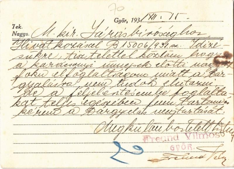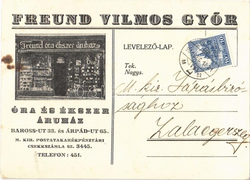 1931 Győr, Freund Vilmos óra és ékszer áruháza, üzlet kirakata, reklámlap. Baross út 33. és Árpád út 65. Freund Vilmos levele a zalaegerszegi M. kir. Járásbírósághoz (felületi sérülés / surface damage)