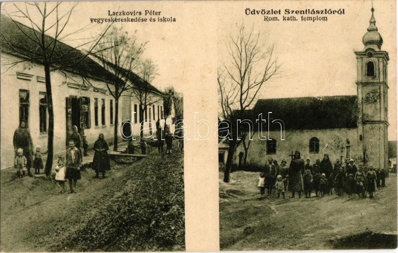Beschreibung: 1935 Szentlászló (Baranya), Római katolikus templom, iskola, Laczkovics Péter vegyeskereskedése