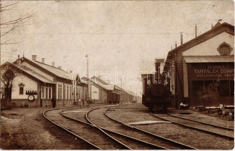 Beschreibung: ~1900 Szolnok, vasútállomás, IV. Oszt. Tartalék. Csapat gyülekezési helye, gőzmozdony. photo (EK)