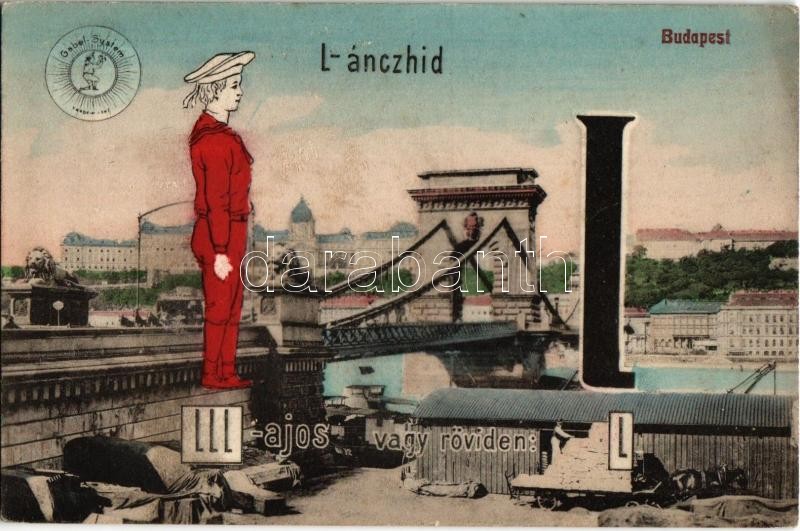 Budapest, Lánchíd. LLL-ajos vagy röviden L. Gabel System ABC montázsla... https://www.darabanth.com/de/32-Gross-Auktion/32.1/Ansichtskarten/Ungarn~13725/Budapest-Lanchid-LLL-ajos-vagy-roviden-L-Gabel-System-ABC-montazslap-hatoldalon-az-L-betC5~II1948262