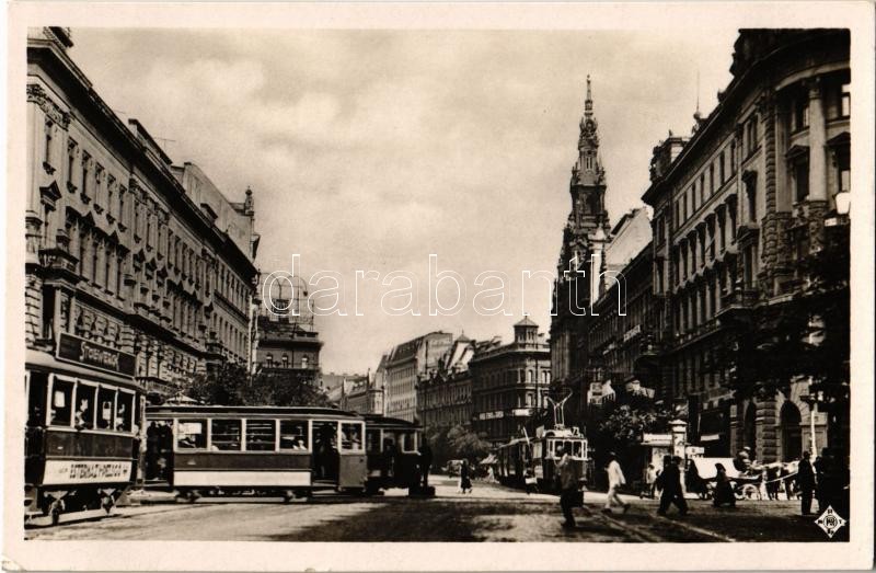 Beschreibung: Budapest VII. Erzsébet körút, villamosok Stollwerck reklámmal, Persil, New York Kávéház