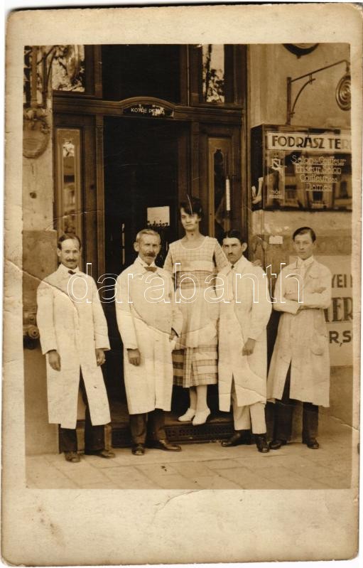 Budapest VIII. Kotré Péter fodrász terme fodrászokkal. Baross tér 9. (... https://www.darabanth.com/de/32-Gross-Auktion/32.1/Ansichtskarten/Ungarn~13725/Budapest-VIII-Kotre-Peter-fodrasz-terme-fodraszokkal-Baross-ter-9-fa~II2035320