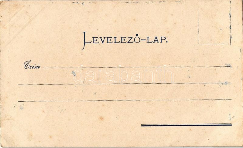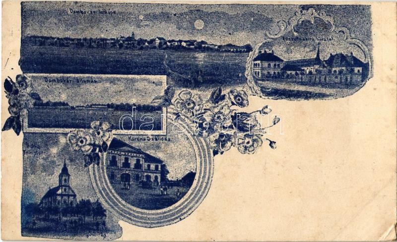Beschreibung: Dombóvár, vasútállomás, Városi szálloda, Katolikus templom, Főszolgabírói hivatal, este. Art Nouveau, floral (EK)