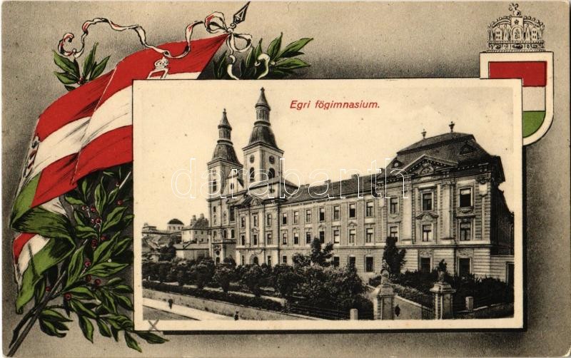 Beschreibung: Eger, Főgimnázium. Magyar zászlós és címeres szecessziós lap. Art Nouveau