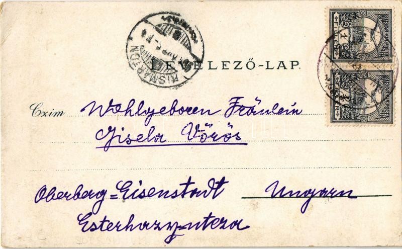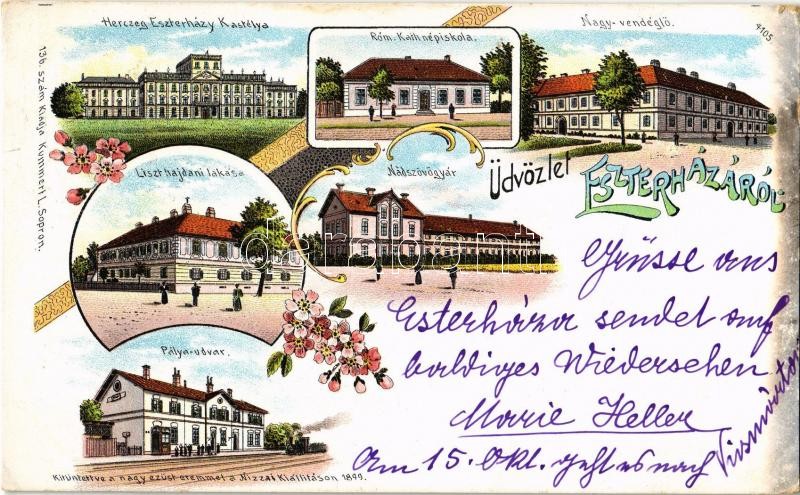 Eszterháza (Fertőd), Herceg Eszterházy kastély, Római katolikus népiskola, Nádszövőgyár, Nagy vendéglő, Liszt hajdani lakása, vasútállomás. Kitüntetve a nagy ezüst éremmel a Nizzai Kiállításon 1899-ben. Kummert L. 136. Art Nouveau, floral, litho (EK)