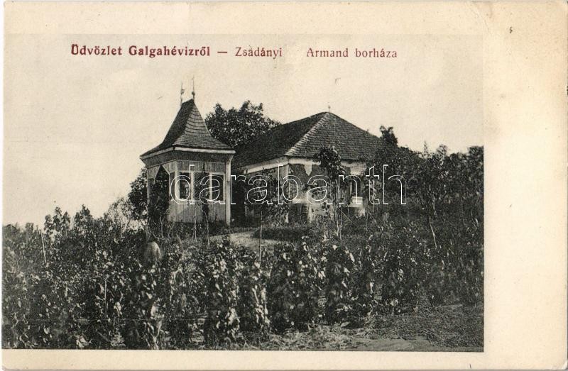 Galgahévíz, Zsadányi Armand borháza, szőlőskert https://www.darabanth.com/de/32-Gross-Auktion/32.1/Ansichtskarten/Ungarn~13725/Galgaheviz-Zsadanyi-Armand-borhaza-szoloskert~II2038167