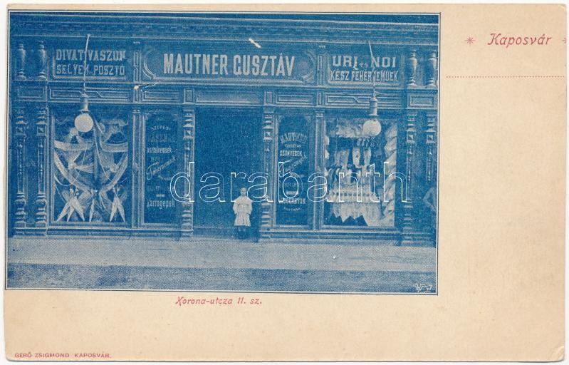 Kaposvár, Mautner Gusztáv divatszalonja és ruha üzlete. Korona utca 11... https://www.darabanth.com/de/32-Gross-Auktion/32.1/Ansichtskarten/Ungarn~13725/Kaposvar-Mautner-Gusztav-divatszalonja-es-ruha-uzlete-Korona-utca-11-Gero-Zsigmond-kiadasa-~II2038273