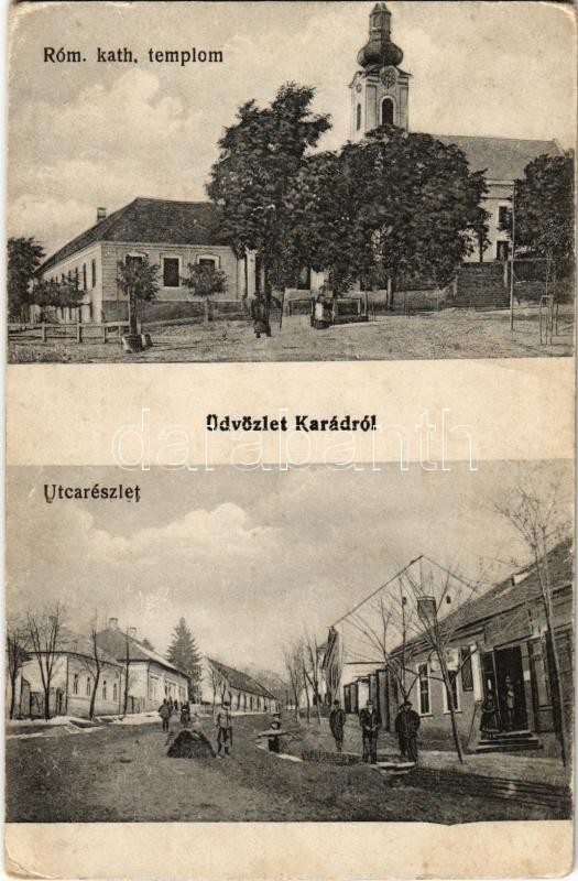 Beschreibung: Karád, Római katolikus templom, utca, üzlet (Rb)
