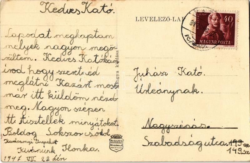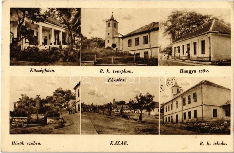 Beschreibung: Kazár, Községháza, Római katolikus templom és iskola, Fő utca, Hősök szobra, Hangya szövetkezet üzlete és saját kiadása (EK)