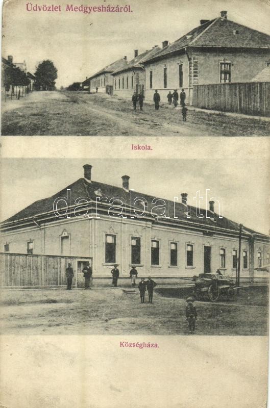 Beschreibung: Medgyesegyháza, iskola, községháza, utca. Vidovenyecz János kiadása (EK)