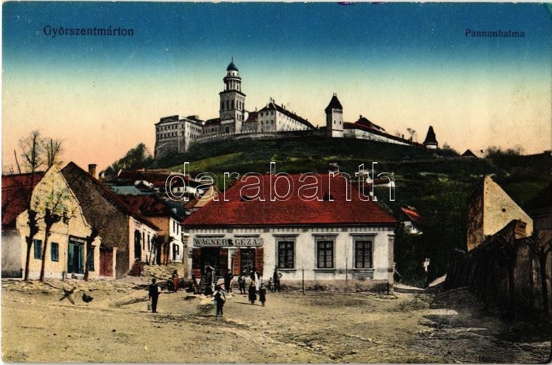 Beschreibung: Pannonhalma, Győrszentmárton; Fő tér, gyógyszertár, Wágner Géza üzlete és saját kiadása