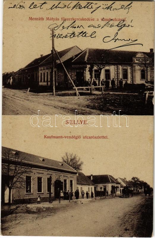 Sellye, Kaufmann vendéglő, Vasút utca, Menráth Mátyás fűszer kereskedé... https://www.darabanth.com/de/32-Gross-Auktion/32.1/Ansichtskarten/Ungarn~13725/Sellye-Kaufmann-vendeglo-Vasut-utca-Menrath-Matyas-fuszer-kereskedese-es-sajat-kiadasa~II2037956