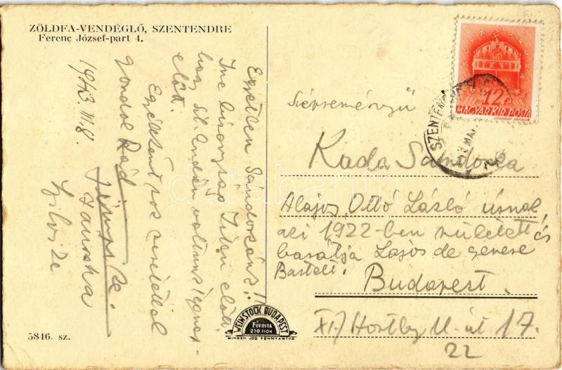 Szentendre, Zöldfa vendéglő, kerthelyiség, terasz. Ferenc József part ... https://www.darabanth.com/de/32-Gross-Auktion/32.1/Ansichtskarten/Ungarn~13725/Szentendre-Zoldfa-vendeglo-kerthelyiseg-terasz-Ferenc-Jozsef-part-4-EK~II1942987
