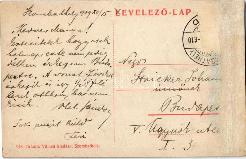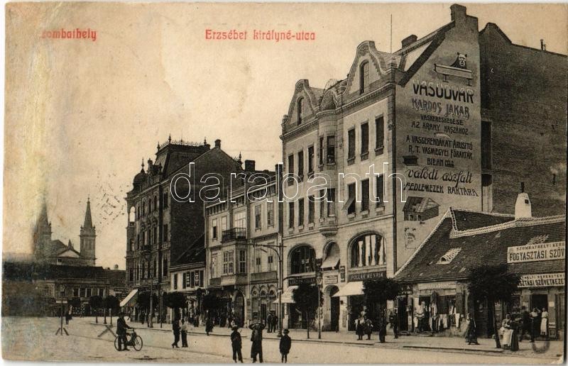Szombathely, Erzsébet királyné utca, Kardos Jakab vasudvara, Pollák Henrik üzlete, Szombathelyi Keresztény Fogyasztási Szövetkezet fiókja és üzlete, kerékpáros. Gránitz Vilmos kiadása (r)