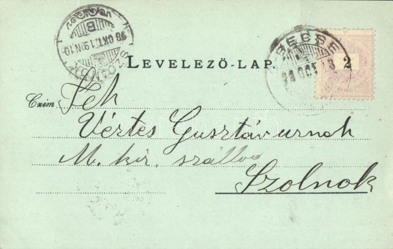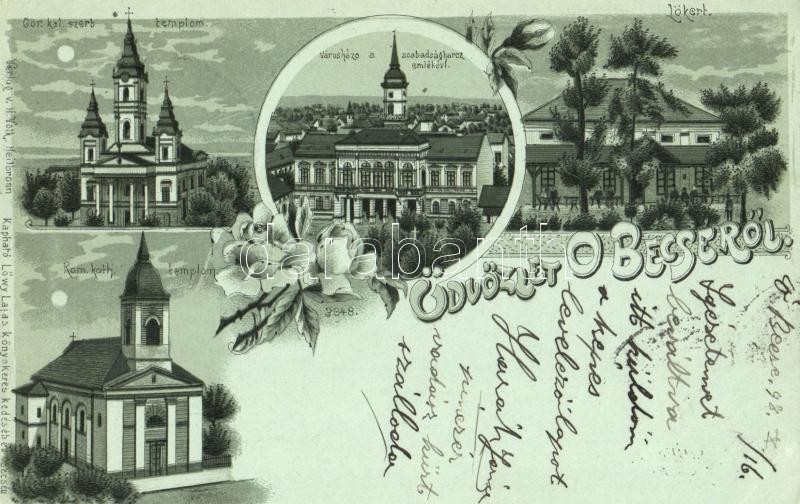 1898 (Vorläufer!) Óbecse, Stari Becej; Görög katolikus szerb és Római katolikus templomok, városháza, szabadságharc emléke, Lőkert. Kapható Löwy Lajosnál / churches, town hall, military monument. Art Nouveau, floral, litho