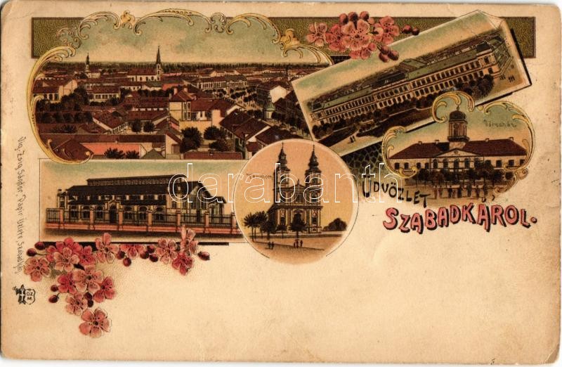 1899 Szabadka, Subotica; városháza, törvényszéki palota, templom, vasútállomás. Víg Zsig. Sándor kiadása / town hall, church, court palace, railway station. Art Nouveau, floral, litho (EB)