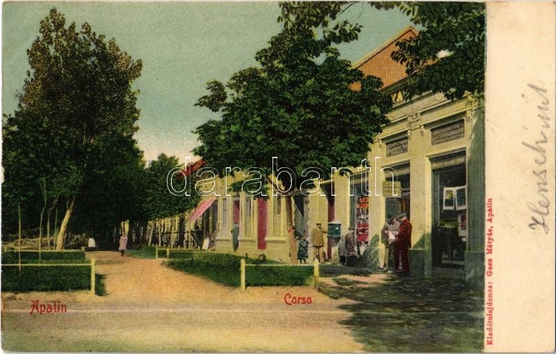 Beschreibung: 1904 Apatin, Corso, Gasz Mátyás papíráruháza és saját kiadása / street view with paper shop