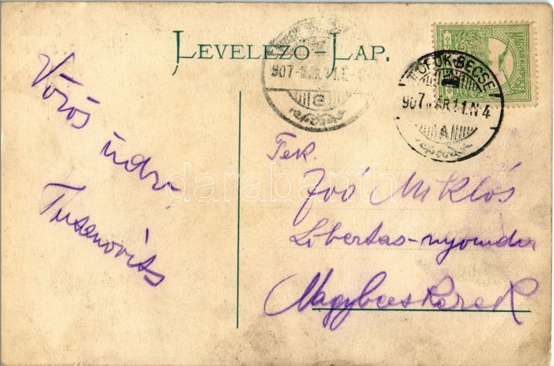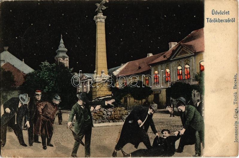 1907 Törökbecse, Újbecse, Novi Becej; Fő tér, Royal szálloda, Turul szabadság szobor, Vidovits Dusan üzlete. részeges humoros montázs este / main square, hotel, shop, statue. Drunk humour montage at night (fl)