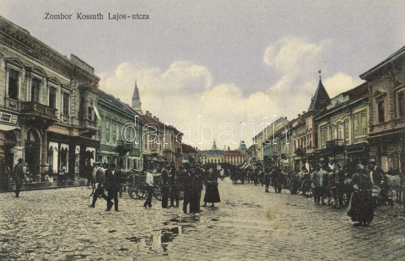 Beschreibung: 1910 Zombor, Sombor; Kossuth Lajos utca, Kollár József üzlete és saját kiadása / street, shops (EK)