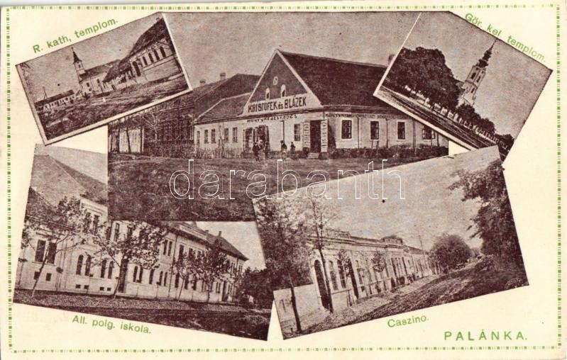 Palánka, Bácska-Palánka, Backa Palanka; Római katolikus és görögkeleti templom, állami polgári iskola, kaszinó, Kristofek és Blázek könyvkereskedése / churches, school, casino, book shop (vágott / cut)