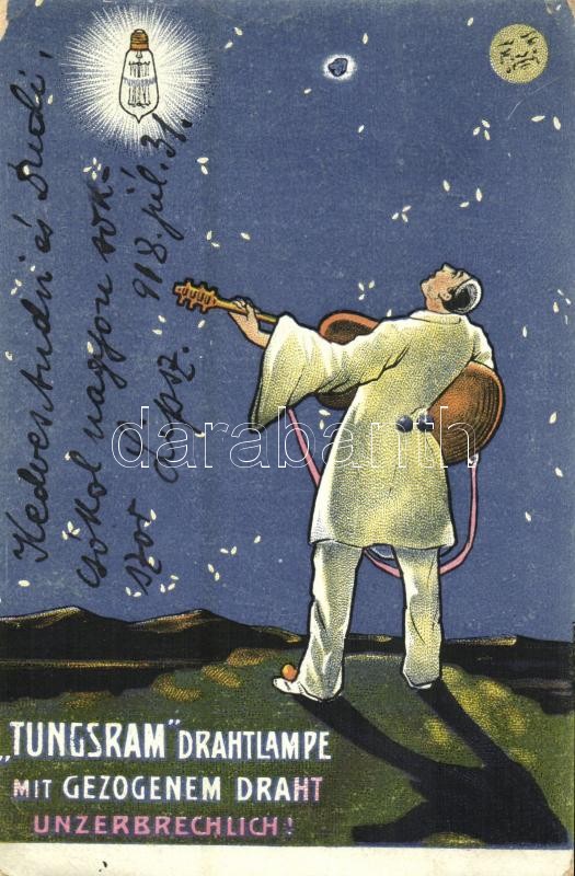 Beschreibung: 1918 Tungsram Drahtlampe mit Gezogenem Draht Unzerbrechlich! / Tungsram drótlámpa reklámlapja / Hungarian wire lamp advertisement. litho (EK)