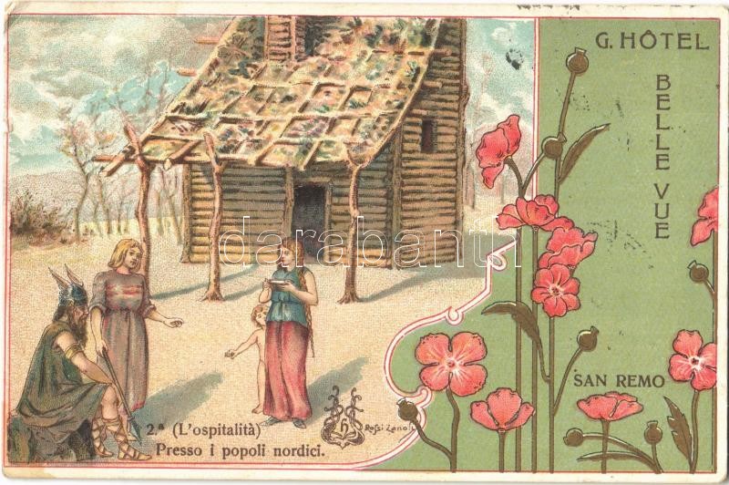 Beschreibung: Grand Hotel Belle Vue in San Remo. L'ospitalitá, presso i popoli nordici / Hotel's advertisement card, Art Nouveau, floral, litho (EK)