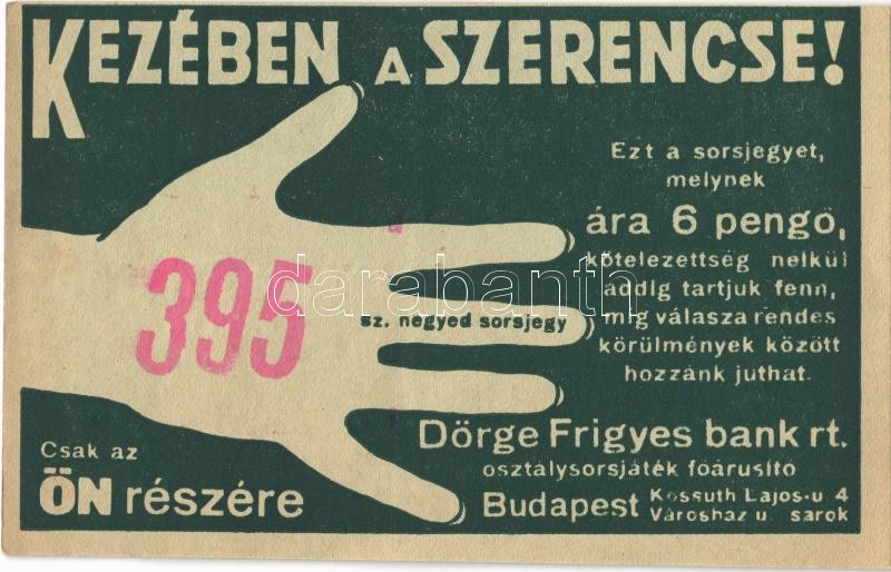 Kezében a Szerencse! Dörge Frigyes bank rt. osztálysorsjáték főárusító sorsjegye. Budapest, Kossuth Lajos utca 4. reklám / Hungarian charity lottery ticket advertisement