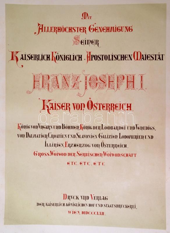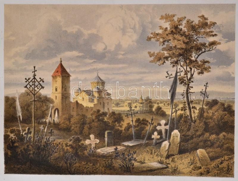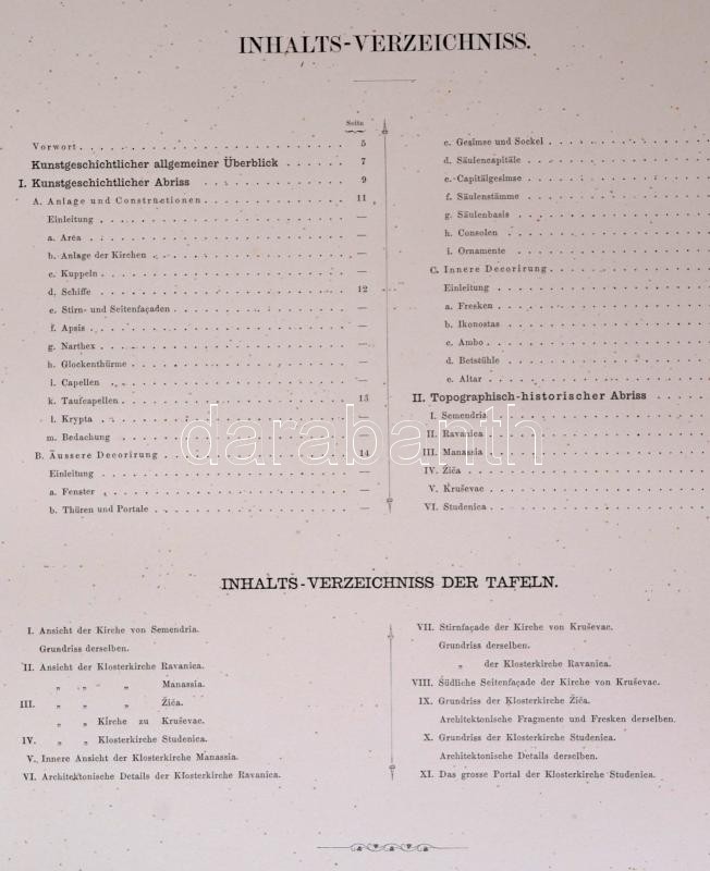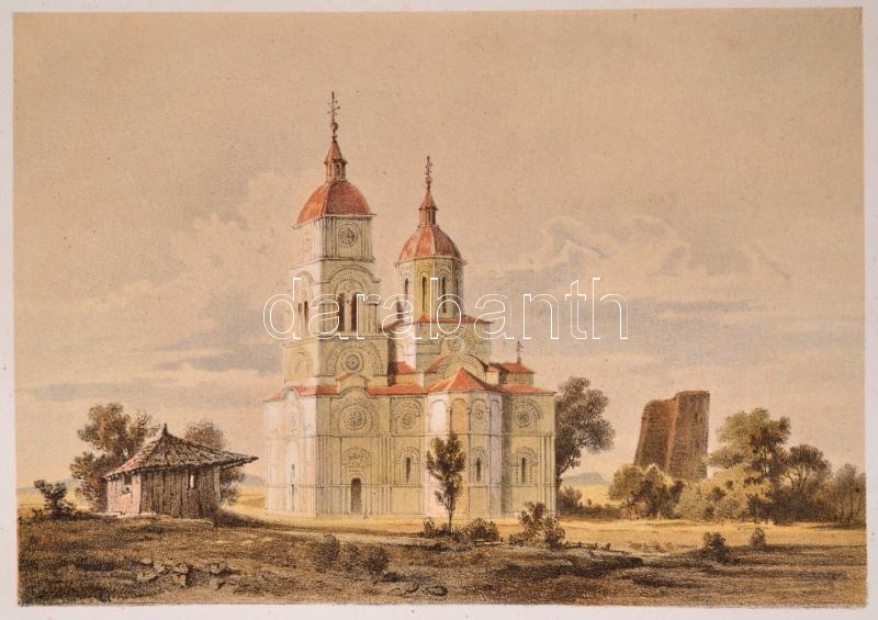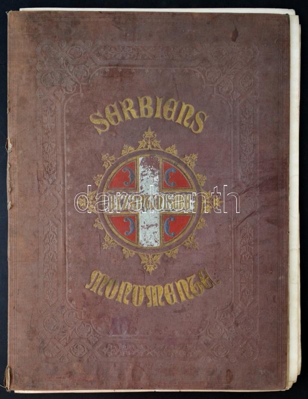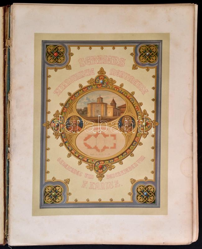 Cf. F. Kanitz: Serbiens byzantinische Monumente / gezeichnet und beschrieben von F. Kanitz. Wien, 1862. 12 lithografált táblával. Eredeti festett egészvászon kötésben. Kopott, lapokon foltok. Imperial folio. Rendkívül ritka mű. / With 12 litho tables. In original linen binding. Tattered, some stains on pages. Very rare. 45x60 cm