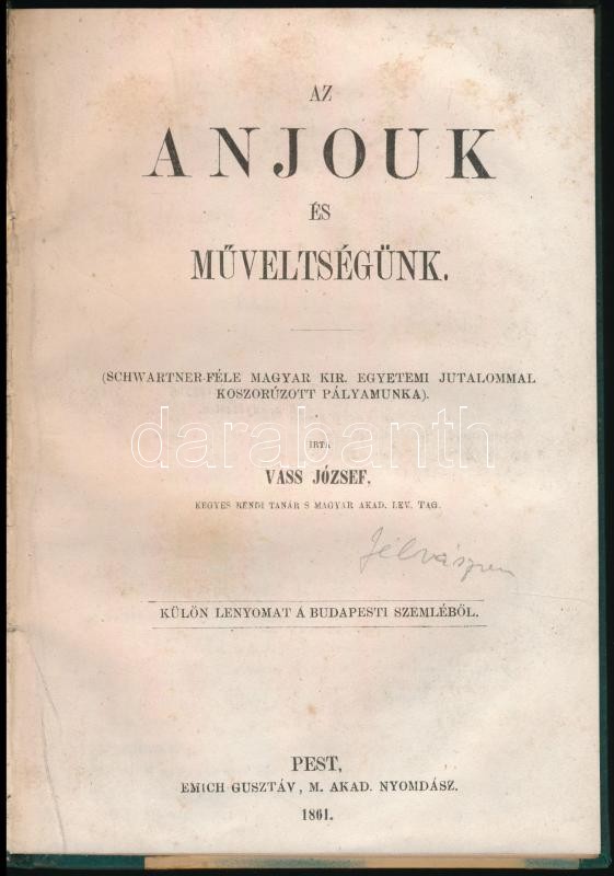 Pest, 1861. Emich G. [4]+VII+[1]+126 p. (Klny a Budapesti Szemléből.) Későbbi félvászon kötésben./ Half-linen-binding, in Hungarian language.