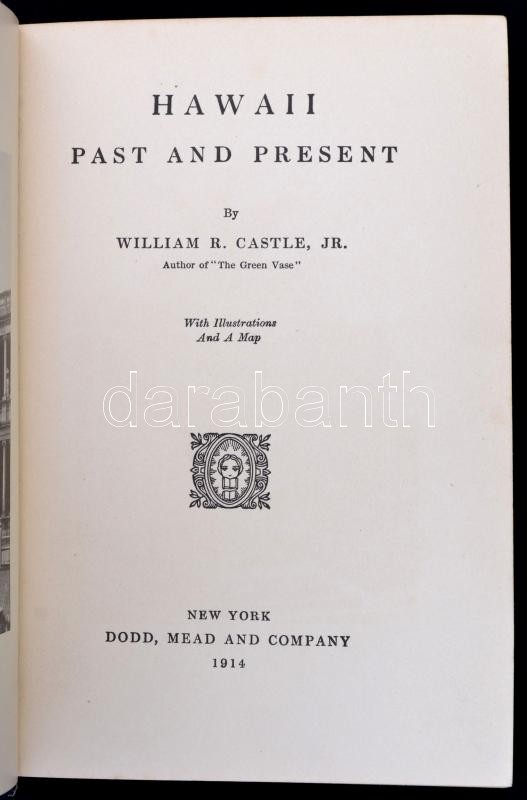 Jr. William R. Castle: Hawaii Past and Present. New York, 1914, Dodd, Mead and Co. Angol nyelven. Egészoldalas fekete-fehér fotókkal és egy térképpel illusztrált. Kiadói festett, illusztrált egészvászon-kötés./With black-and-white photographs and one map. Linen-binding, in English language.