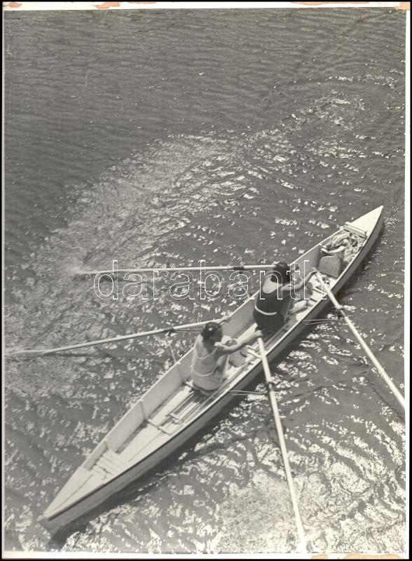 cca 1937 Thöresz Dezső (1902-1963) békéscsabai gyógyszerész és fotóművész hagyatékából jelzés nélküli vintage fotó, kasírozva (Kétpárevezős hajó), 40x30 cm