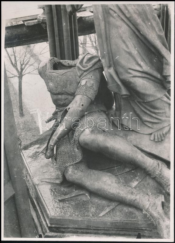 Beschreibung: cca 1940 A megrongált Hentzi-szobor a katonai alreáliskola udvarán, fotó, hátulján feliratozva, leírással, 16,5×12 cm