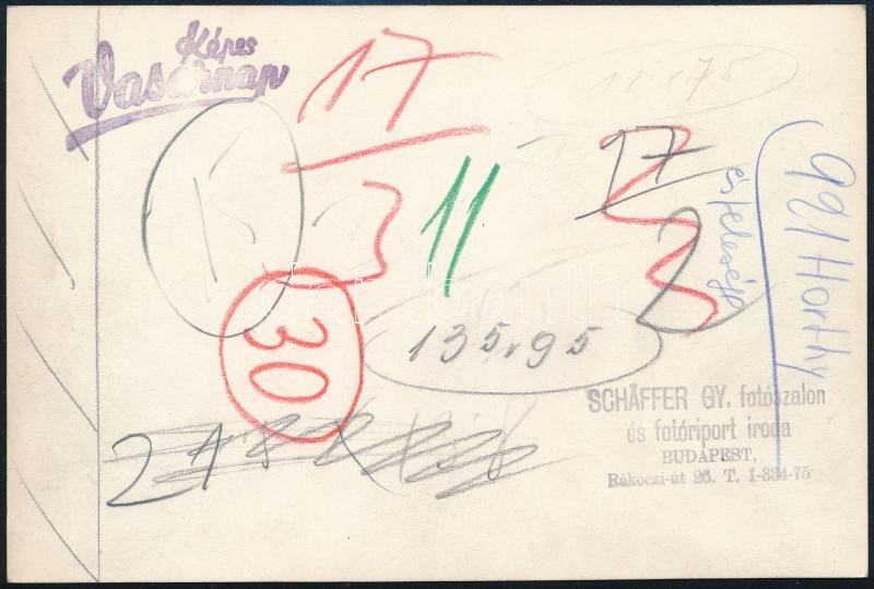 Beschreibung: cca 1940 Horthy Miklós (1868-1957) kormányzó és felesége katonákkal, fotó Schäffer fotószalonjából, pecséttel jelzett, 12×18 cm