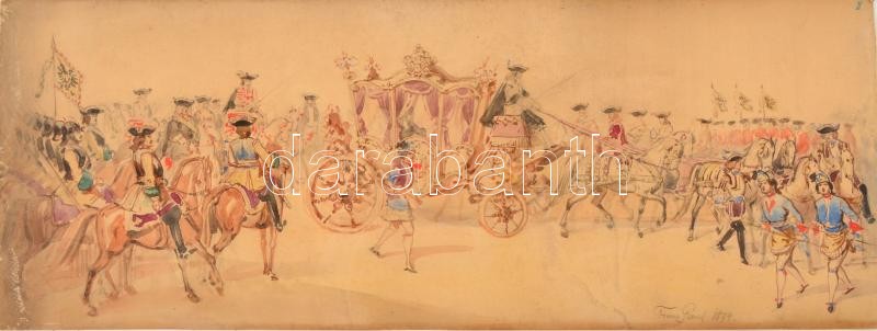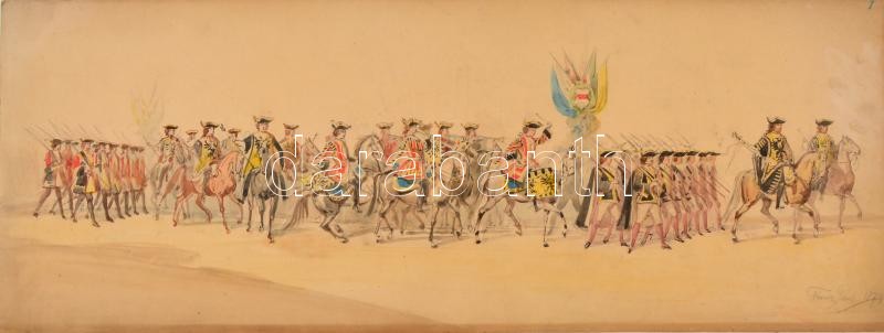 1874 Franz Gaul (1837-?) 2 db színpadkép terv. Akvarell, papír, vásznon. Jelzett. 25x66 cm (2x) / Theatre play design. Watercolor, paper on canvas. 25x66 cm (2x)