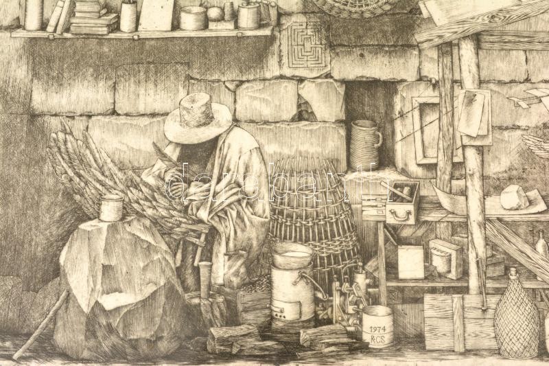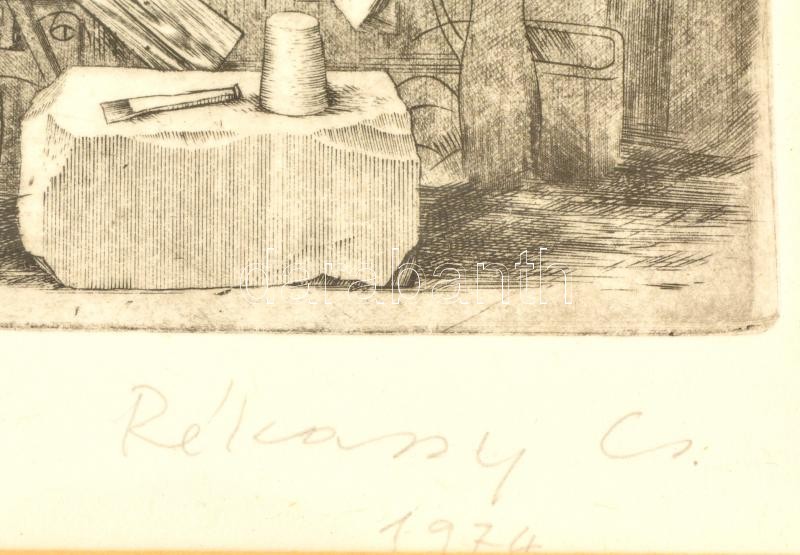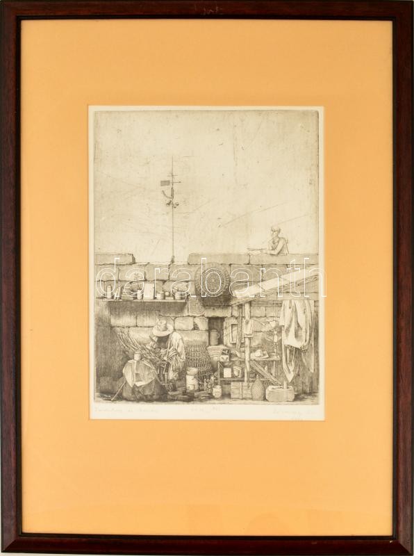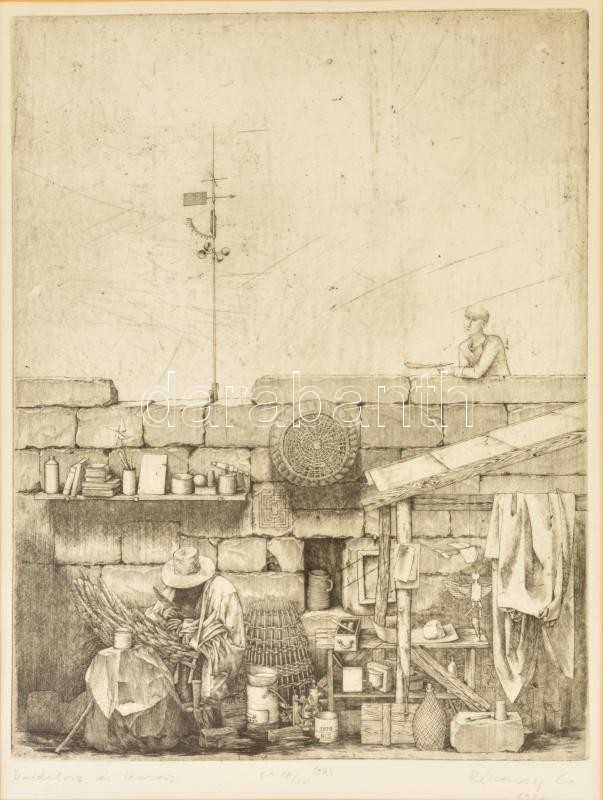 Beschreibung: Rékassy Csaba (1937-1989): Daidalosz és Ikarosz. Rézkarc XII/XV (P.H.), papír, jelzett (utólag), üvegezett keretben, 39×29 cm