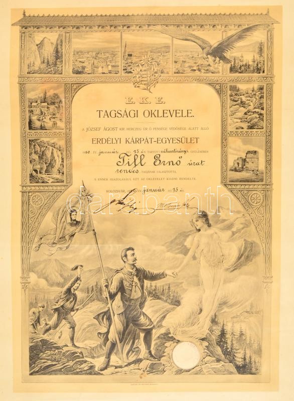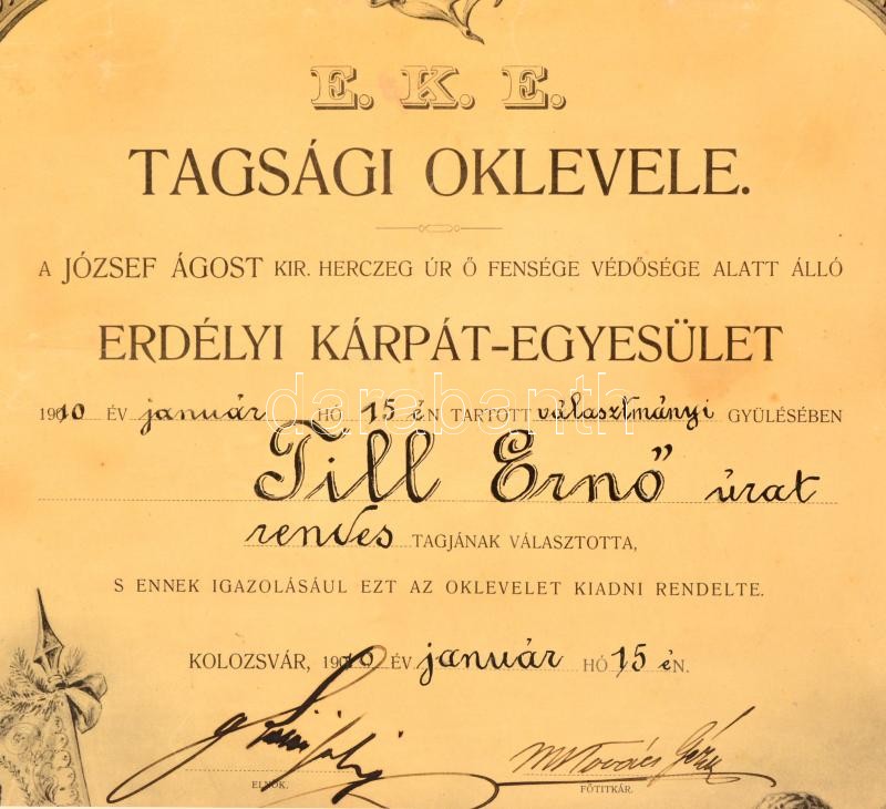 1910 Az Erdélyi Kárpát Egyesület díszes oklevele rendes taggá választá... https://www.darabanth.com/de/32-Gross-Auktion/32.1/Kunst-Dokumente-andere-Sammelgebiete/Dokument~13392/1910-Az-Erdelyi-Karpat-Egyesulet-diszes-oklevele-rendes-tagga-valasztasrol-felcsavarva-ki~II2044155