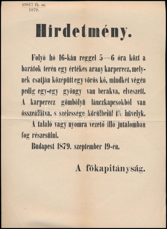 1879 A budapesti főkapitányság hirdetménye elveszett arany karperecről... https://www.darabanth.com/de/32-Gross-Auktion/32.1/Kunst-Dokumente-andere-Sammelgebiete/Drucksachen~13371/1879-A-budapesti-fokapitanysag-hirdetmenye-elveszett-arany-karperecrol-hajtott~II2037820