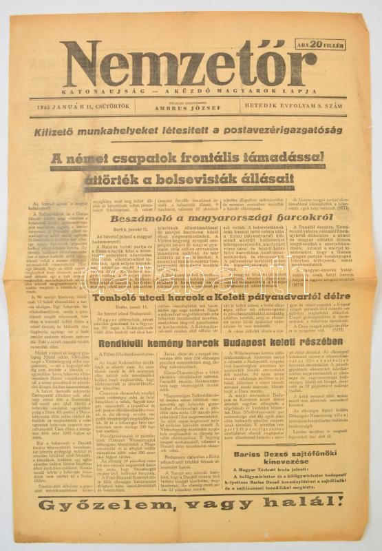 Beschreibung: 1945 A Nemzetőr című újság 7. évfolyamának 9. száma, címlapon a budapesti harcokról szóló cikkel